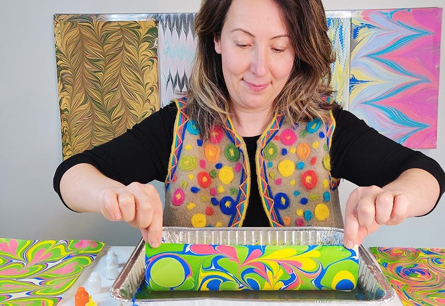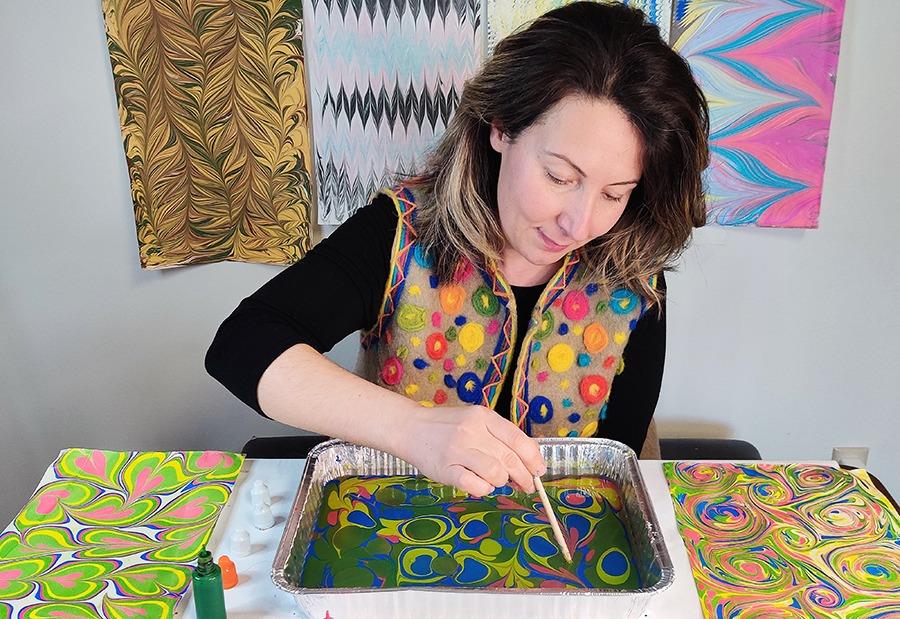 In this Workshop, I will share with you the 600-year-old history, culture and technique of mesmerizing water marbling.  We will explore how to float colors on top of the water, and learn how to transfer those one-of-a-kind designs onto paper.